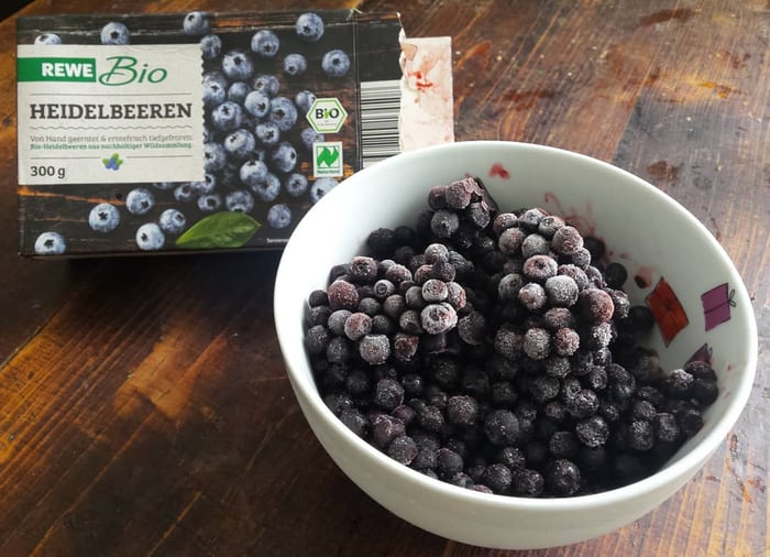 Alternativ gibt es auch etwas günstiger wilde Blaubeeren beim Edeka, welche uns allerdings nicht so gut schmecken, wie die von REWE.