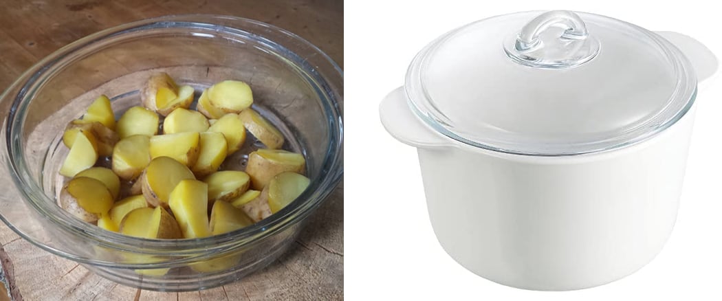 Ursprünglich, als wir mit den Medical Medium Informationen angefangen haben, hatten wir das Ziel Metalle aus der Küche zu minimieren und haben diese Keramik-Kasserolle mit Glasdeckel mit dem passenden Dämpfeinsatz aus Glas für ein Jahr benutzt.